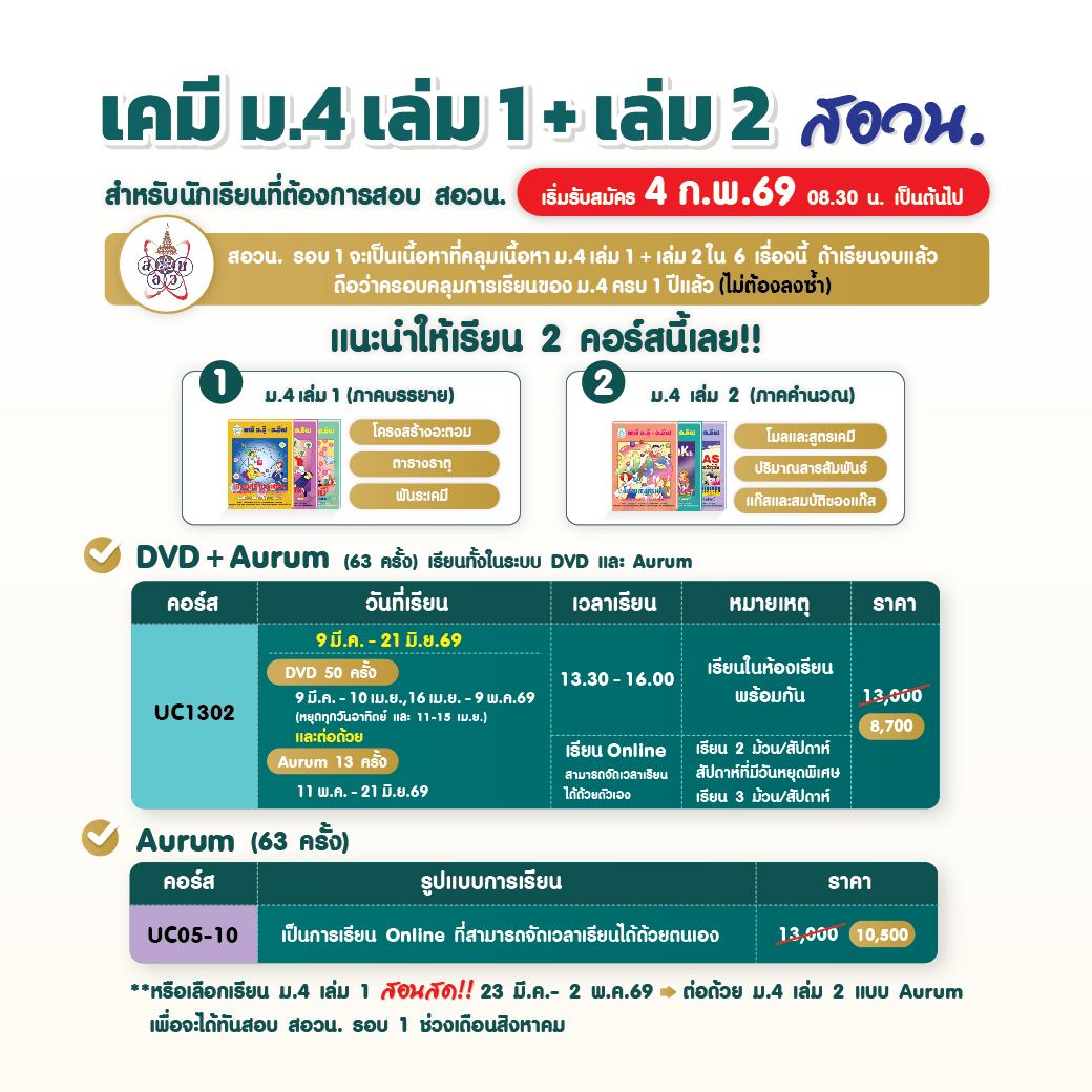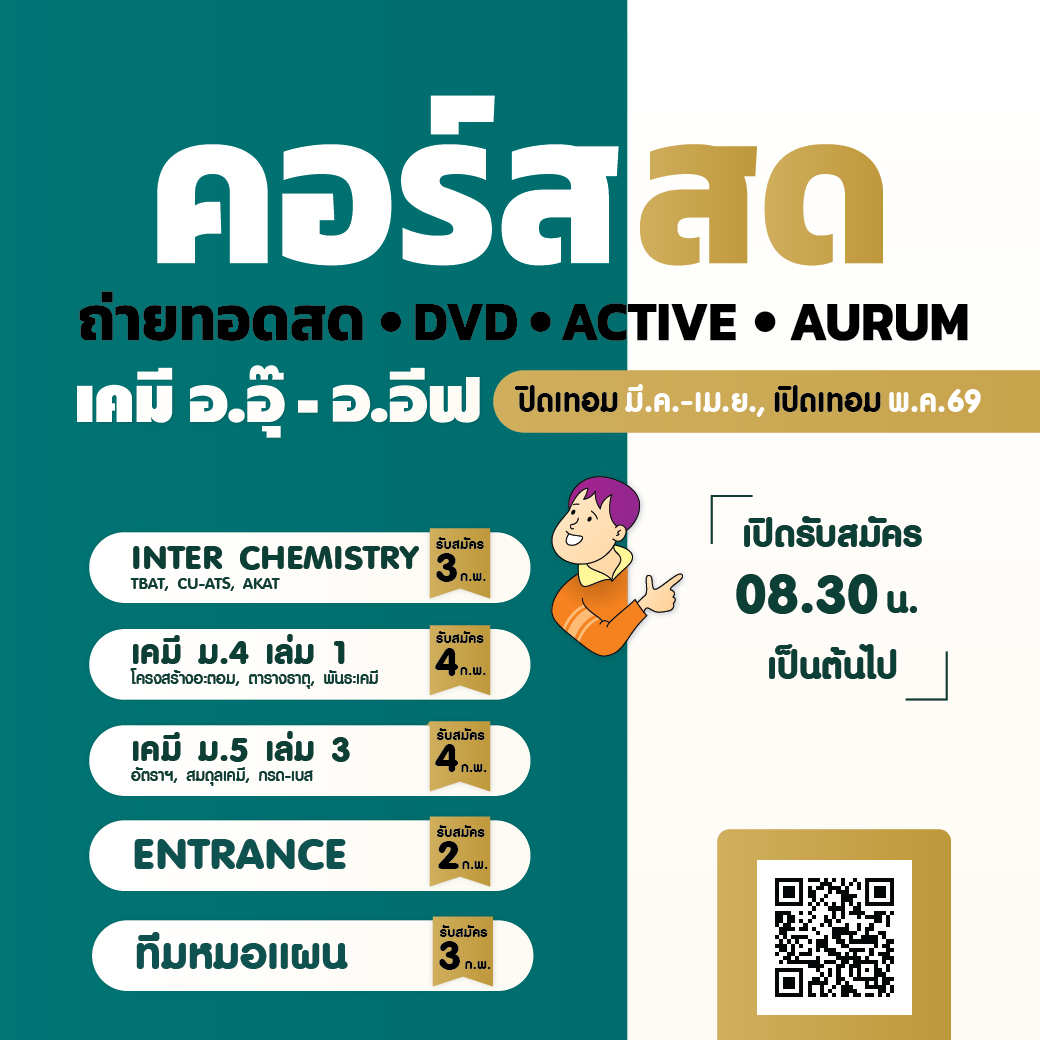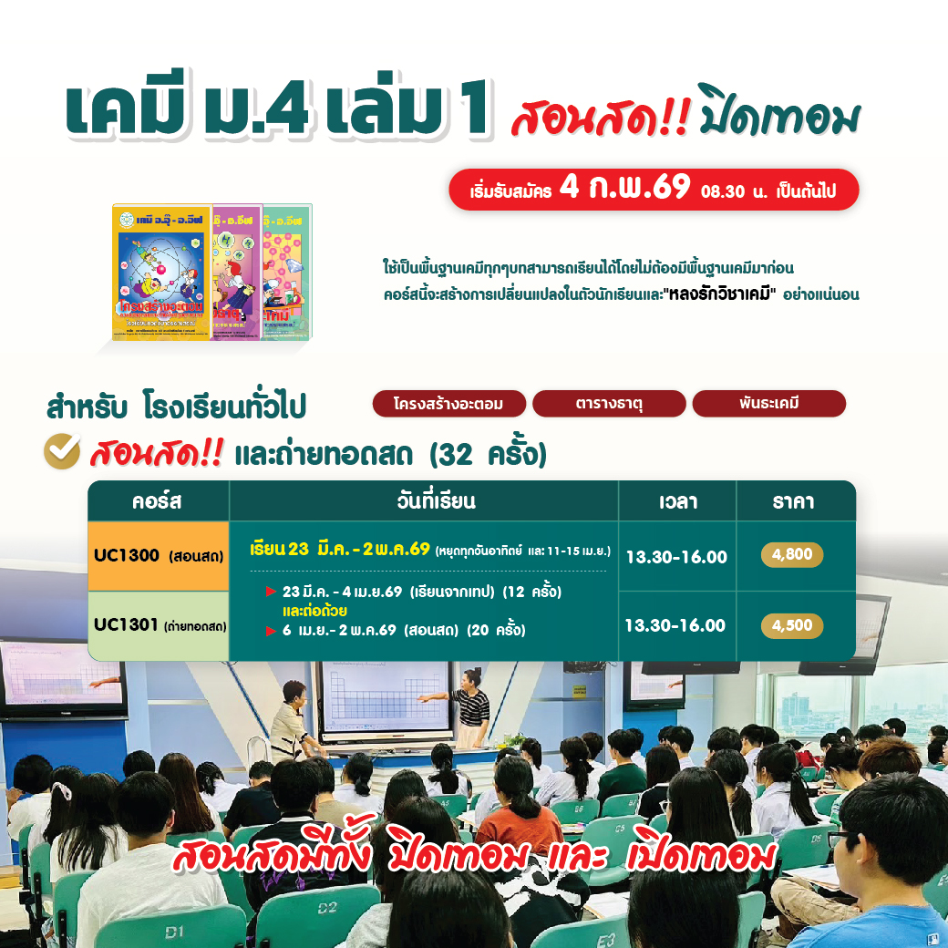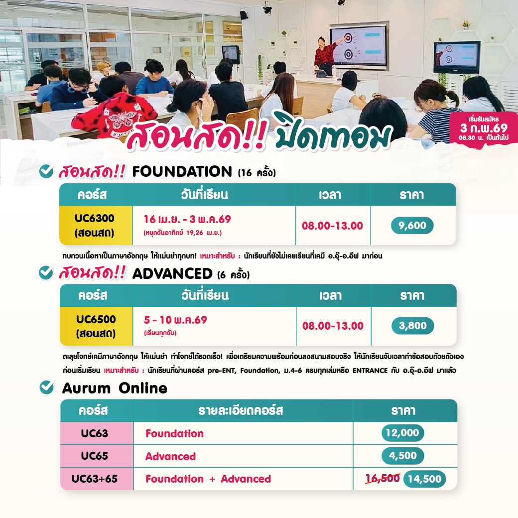 คอร์สสด & ถ่ายทอดสด เคมี อ.อุ๊ - อ.อีฟ (ปิดเทอม มี.ค.-เม.ย. / เปิดเทอม พ.ค.2569) เตรียมตัวให้พร้อม! ใครอยากเรียนเคมีให้เข้าใจจริง เพิ่มเกรด หรือเตรียมสอบเข้า ห้ามพลาดรอบนี้!!