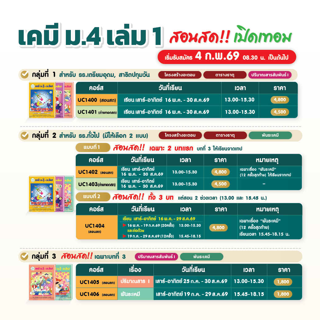 - 4 ก.พ.69 : คอร์ส เคมี ม.4 เล่ม 1