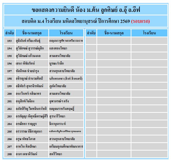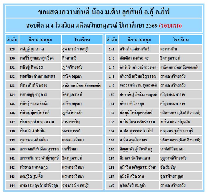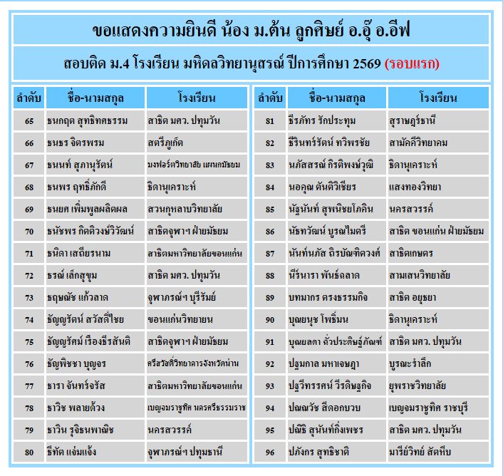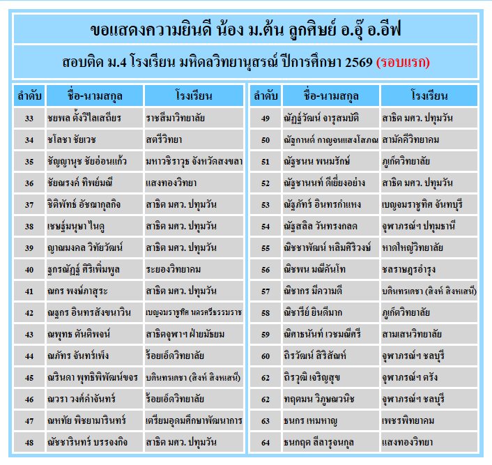 ที่ได้รับคัดเลือกเข้าเรียน ม.4 โรงเรียน มหิดลวิทยานุสรณ์ รอบแรก ได้สำเร็จ