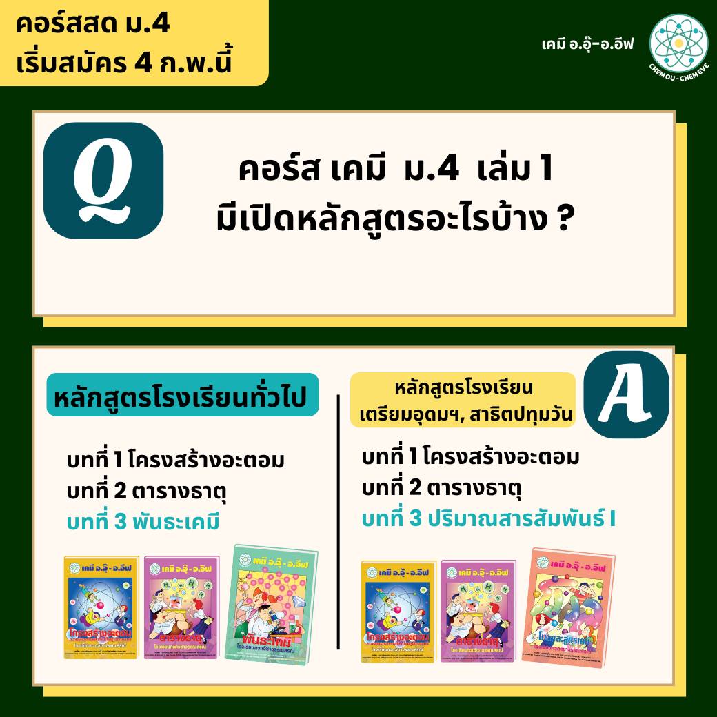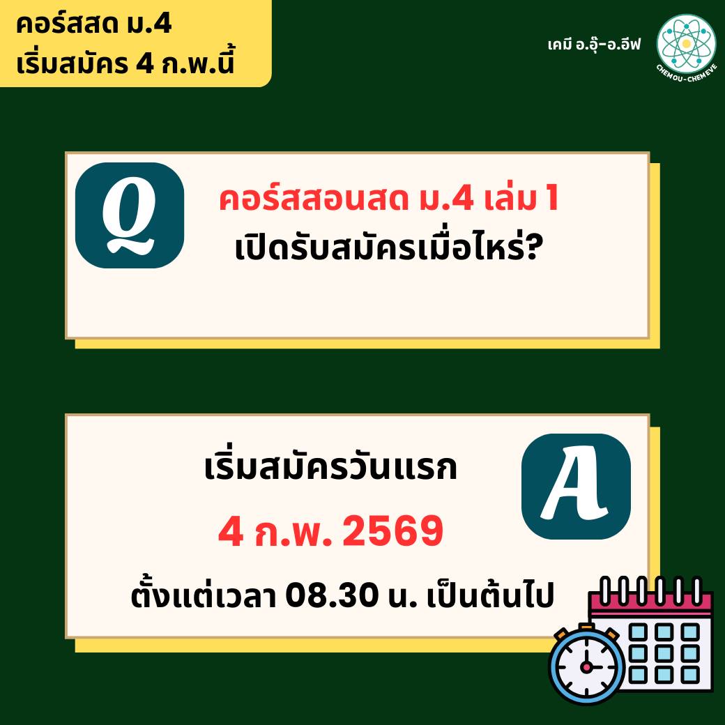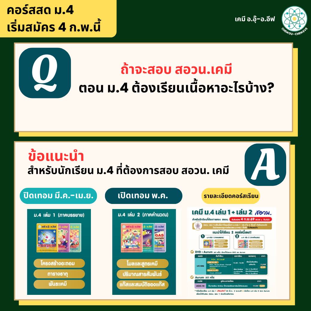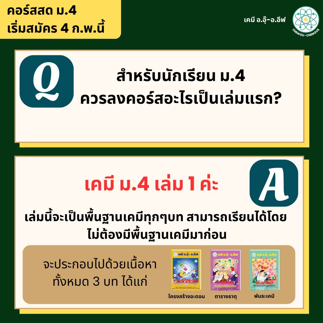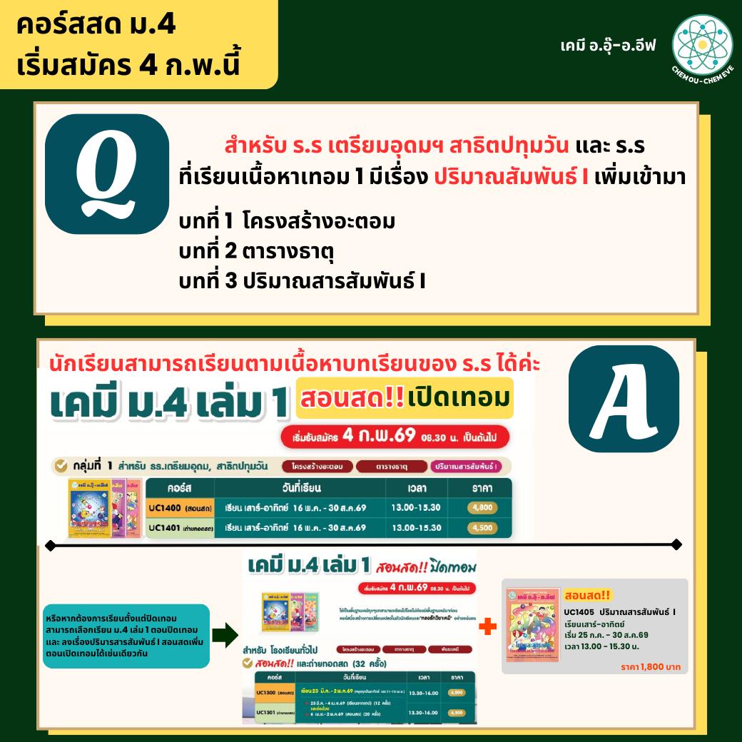 ปิดเทอมนี้ น้องๆ ม.4 สามารถเรียนคอร์สสดเคมีกับอ.อุ๊ และอ.อีฟได้เลยค่ะ