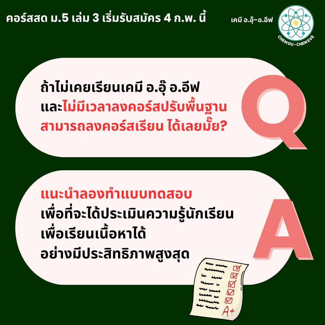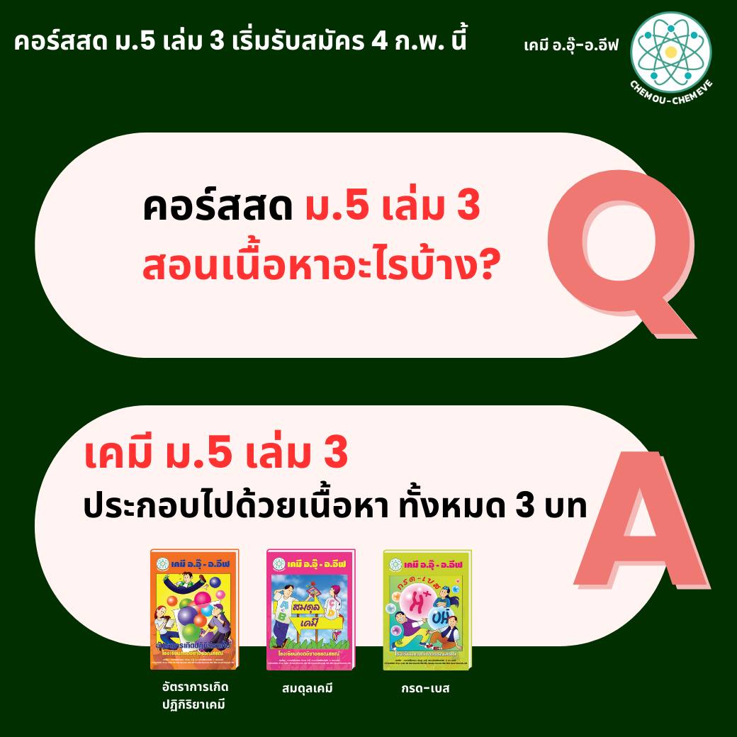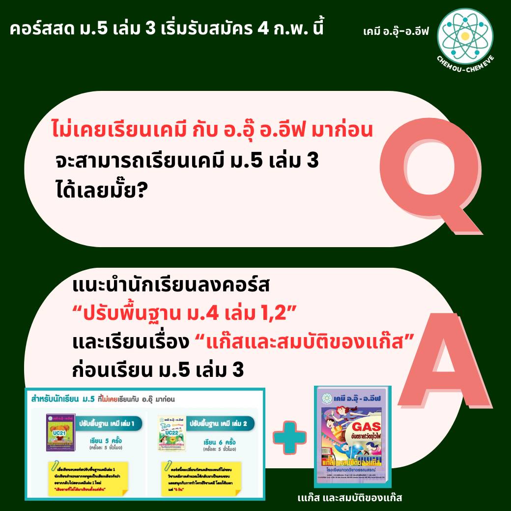 สำหรับน้องๆที่กำลังขึ้น ม.5 ทั้งที่เรียนต่อเนื่องมาจาก ม.4 และทักมาถามว่า อยากมาเริ่มเรียนเคมี ตอน ม.5 พี่ๆได้รวบรวมคำถาม และข้อสงสัย เกี่ยวกับคอร์สเคมี ม.5 มาให้แล้วนะคะ