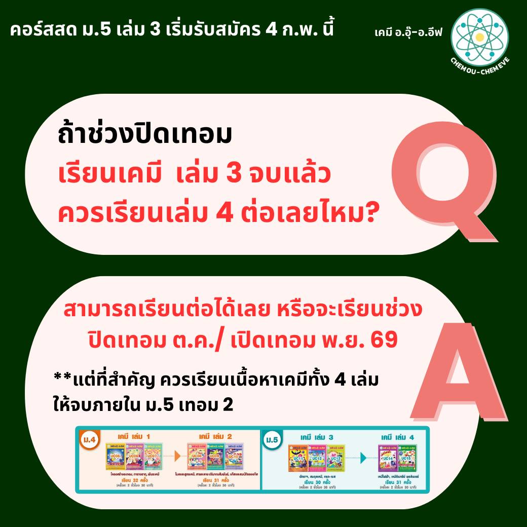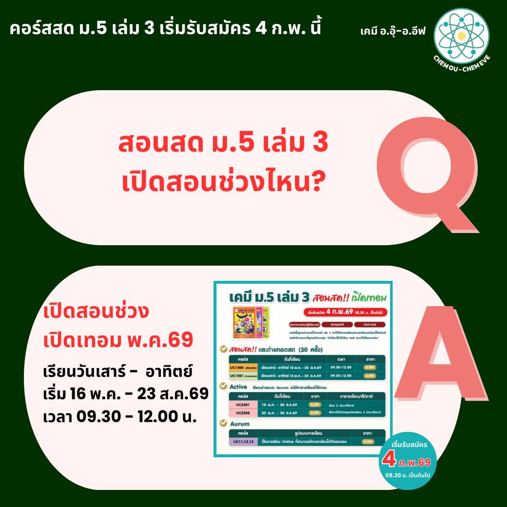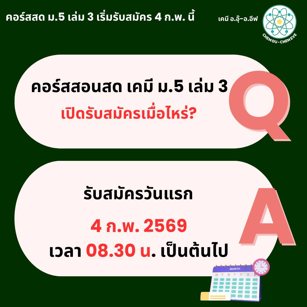 สำหรับน้องๆที่กำลังขึ้น ม.5 ทั้งที่เรียนต่อเนื่องมาจาก ม.4 และทักมาถามว่า อยากมาเริ่มเรียนเคมี ตอน ม.5 พี่ๆได้รวบรวมคำถาม และข้อสงสัย เกี่ยวกับคอร์สเคมี ม.5 มาให้แล้วนะคะ