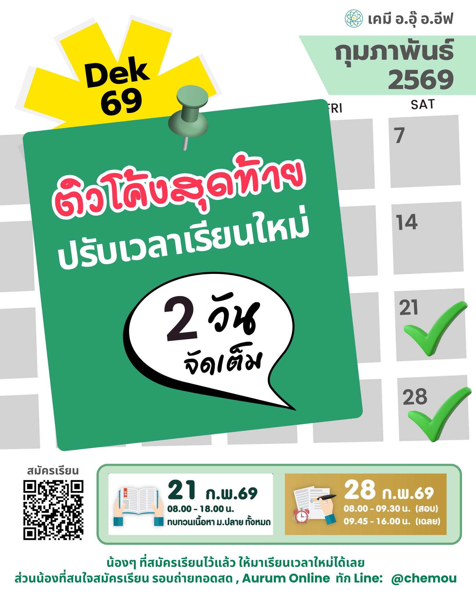อัพเดทคอร์ส #ติวโค้งสุดท้าย ใหม่ค่ะน้อง ๆ เปลี่ยนวัน-เวลา เป็น 2 วัน เริ่มวันเรียนวันที่ 21 ก.พ.69 เวลา 08.00-18.00 น. วันที่ 28 ก.พ.69 เวลา 08.00-09.30 น.(สอบ) และต่อด้วย 09.45 -16.00 น.(เฉลย)