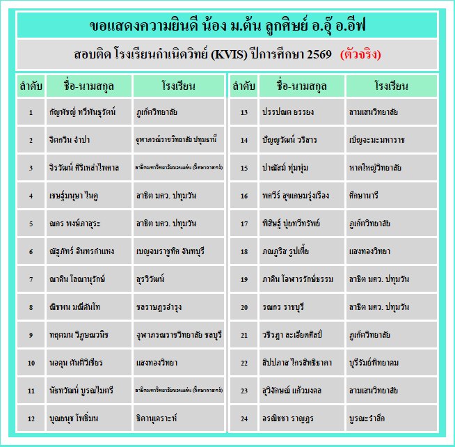 อาจารย์อุ๊ และ พี่อีฟขอแสดงความยินดีกับความสำเร็จของลูกศิษย์ ที่ได้รับคัดเลือกเข้าเรียน ระดับชั้น ม.4 โรงเรียนกำเนิดวิทย์ ขอให้ทุกคนมุ่งมั่น ตั้งใจเรียนต่อไปนะคะ