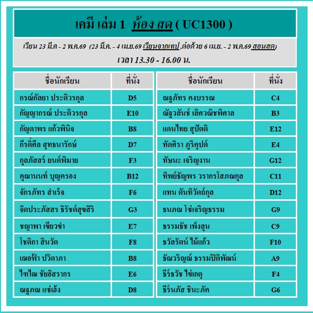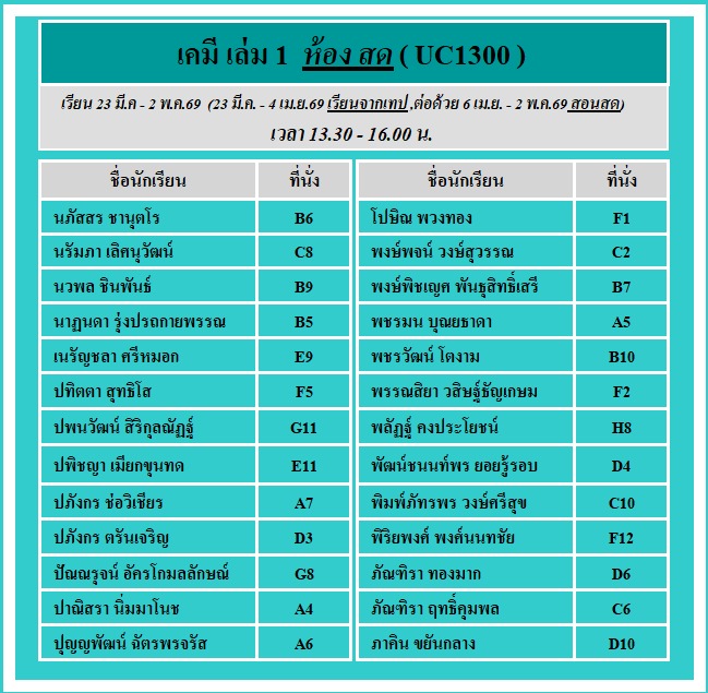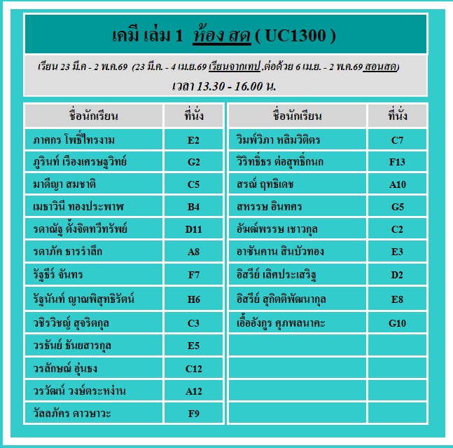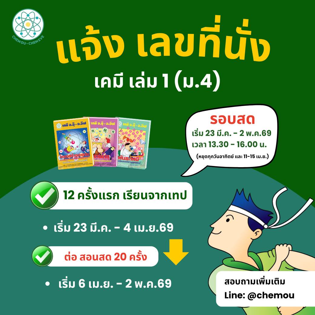 ประกาศ!! รายชื่อและเลขที่นั่งรอบ #สอนสด คอร์ส #ม4เล่ม1 เริ่มเรียนจากเทป 12 ครั้ง และสอนสด 20 ครั้ง ดังนี้ เรียนเทปเริ่ม 23 มี.ค - 4 เม.ย.69 (13.30-16.30 น.) ต่อด้วย สอนสด 6 เม.ย.- 2 พ.ค.69 (13.30 - 16.00 น.)