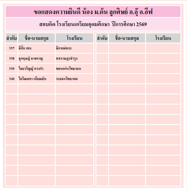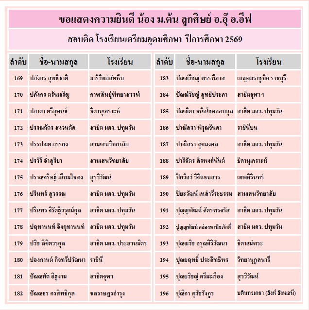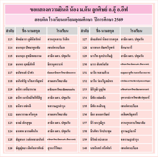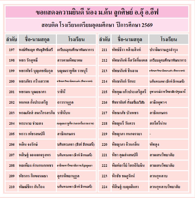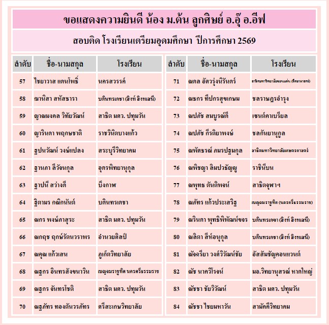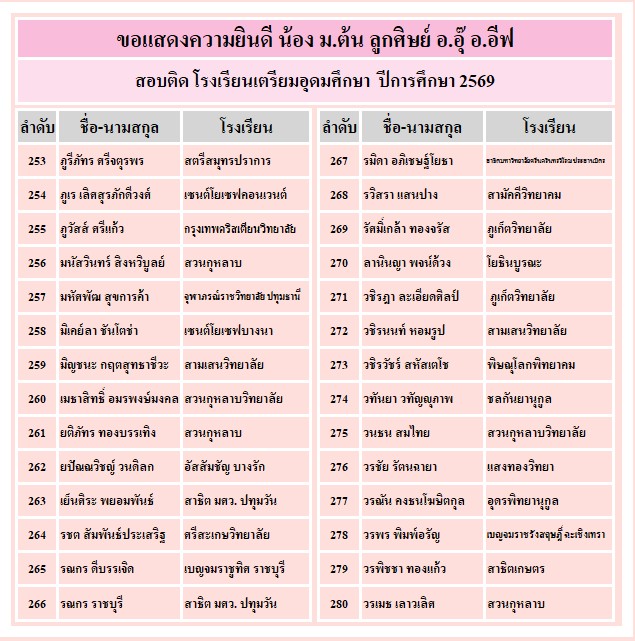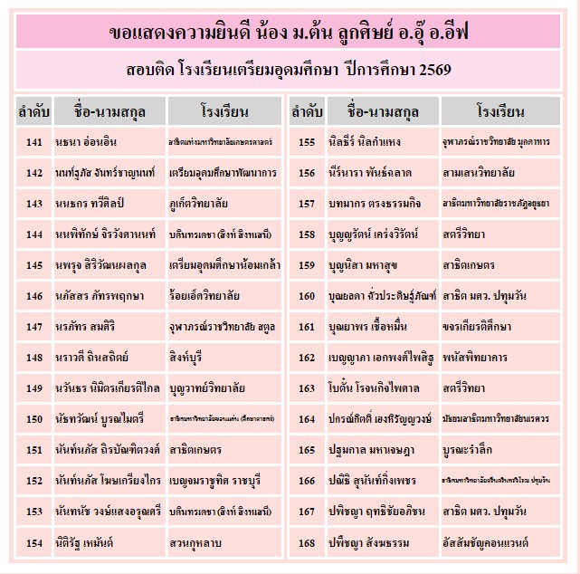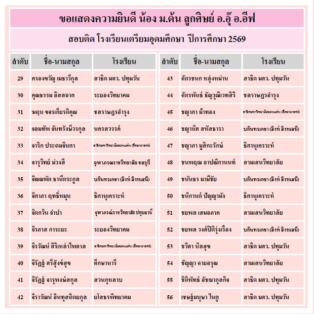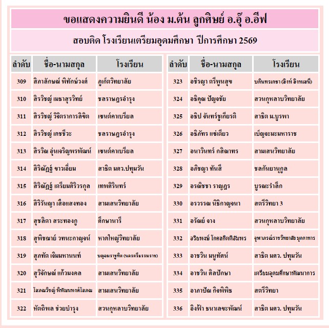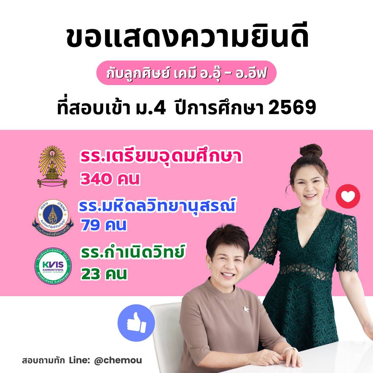 อาจารย์อุ๊ และ พี่อีฟขอแสดงความยินดีกับความสำเร็จของลูกศิษย์ ที่ได้รับคัดเลือกเข้าเรียน ระดับชั้น ม.4 ทั้ง 3 โรงเรียน คือ เตรียมอุดมศึกษา จำนวน 340 คน, มหิดลวิทยานุสรณ์ จำนวน 79 คน และ กำเนิดวิทย์ จำนวน 23 คน ขอให้ทุกคนมุ่งมั่น ตั้งใจเรียนต่อไปนะคะ